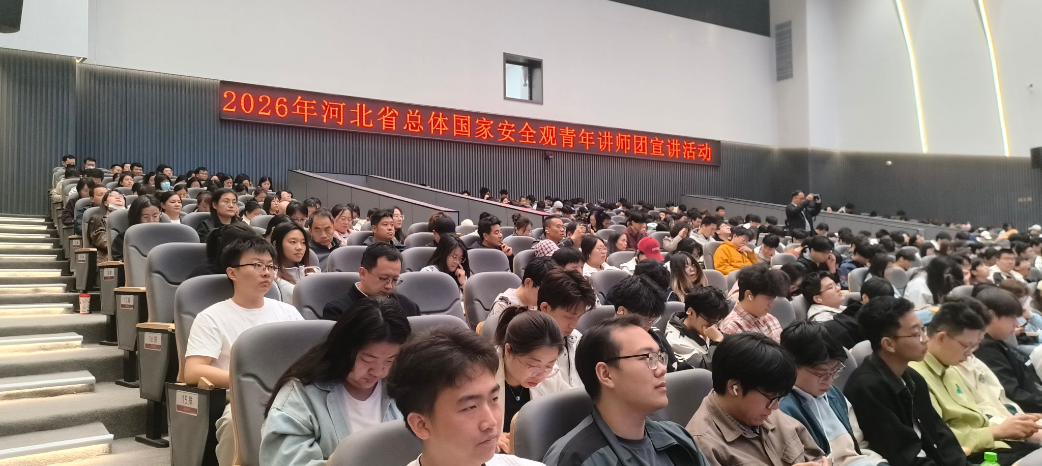我校安全工作处全体人员、各学院安全员与河北地质大学青年师生代表,以及来自全省各市(含定州、辛集市)团委、雄安新区团工委、省属重点高校团委、团省委及省直有关部门的负责同志等共计800余人共同参加了本次宣讲活动。